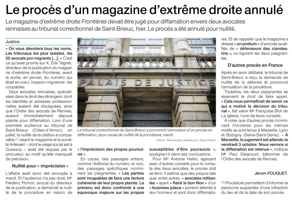 Les avocats qui ont déposé plainte contre le magazine Frontières en raison du numéro dénonçant le laxisme des juges et le militantisme pro-immigration de certains avocats doivent revoir leur droit… Ils avaient du sécher les cours pour aller manifester avec la gauche…
