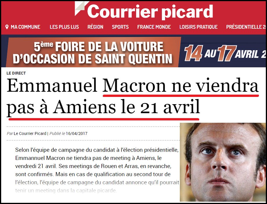 L’équipe Macron a le regret de vous annoncer que le meeting d’Amiens prévu le 21 avril n’aura pas lieu faute de monde :