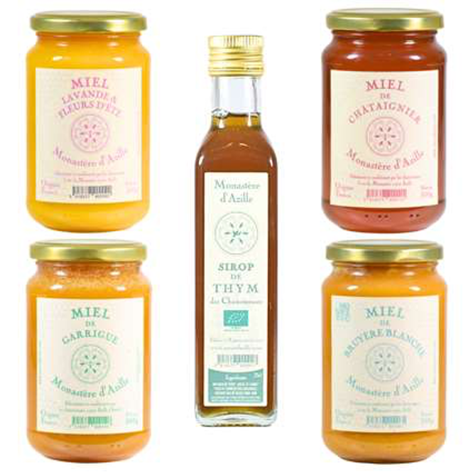 - Cinq miels monastiques différents (formats 125g et 500g) : Lavande, Garrigue, Châtaignier, Bruyère blanche et Bruyère rose. Ces miels sont issus de la production d’apiculteurs locaux, situés à 30km du monastère et mis en pot par les sœurs au sein de leur monastère.
