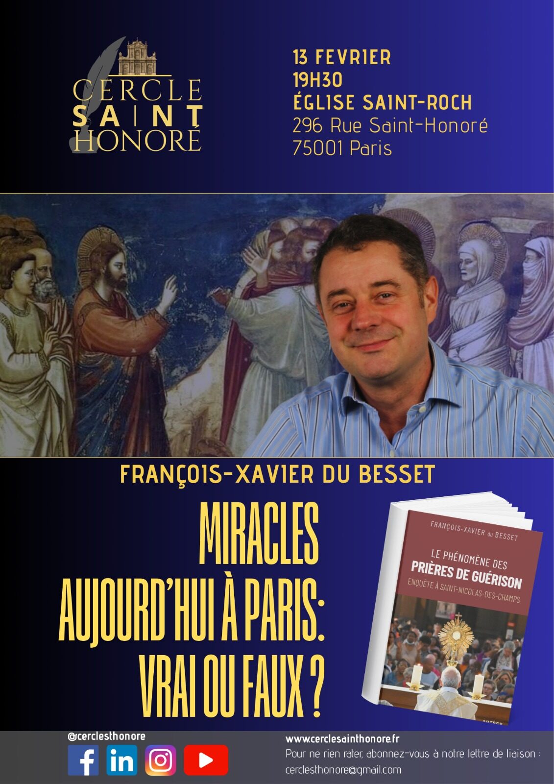 🗓 Le vendredi 13 février, à 19h30 en l’Eglise Saint-Roch, le Cercle Saint-Honoré aura la joie d’accueillir François-Xavier du Besset pour présenter et dédicacer son dernier ouvrage «Le phénomène des prières de guérison».