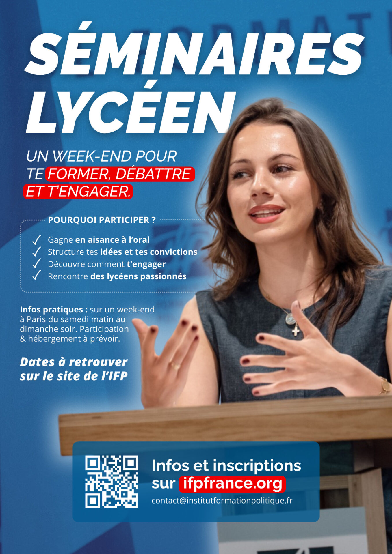 L’Institut de Formation Politique (IFP) organise un séminaire pour les lycéens (15/17 ans) le week-end du samedi 18 au dimanche 19 avril 2026 à Paris.