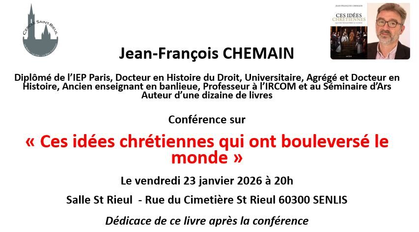 23 janvier : Conférence de Jean-François CHEMAIN : « Ces idées chrétiennes qui ont bouleversé le monde », à Senlis