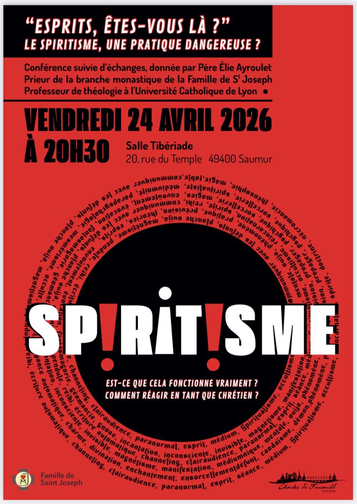 Organisée par la paroisse Saint Charles de Foucauld de Saumur (49), conférence du Père Élie-Joseph Ayroulet, prieur de la branche monastique de la Famille de Saint Joseph, professeur de théologie à l’université catholique de Lyon, sur le spiritisme : “Esprits, êtes-vous là ? Le spiritisme, une pratique dangereuse ? Est-ce que cela fonctionne vraiment ? Comment réagir en tant que chrétien ?”.