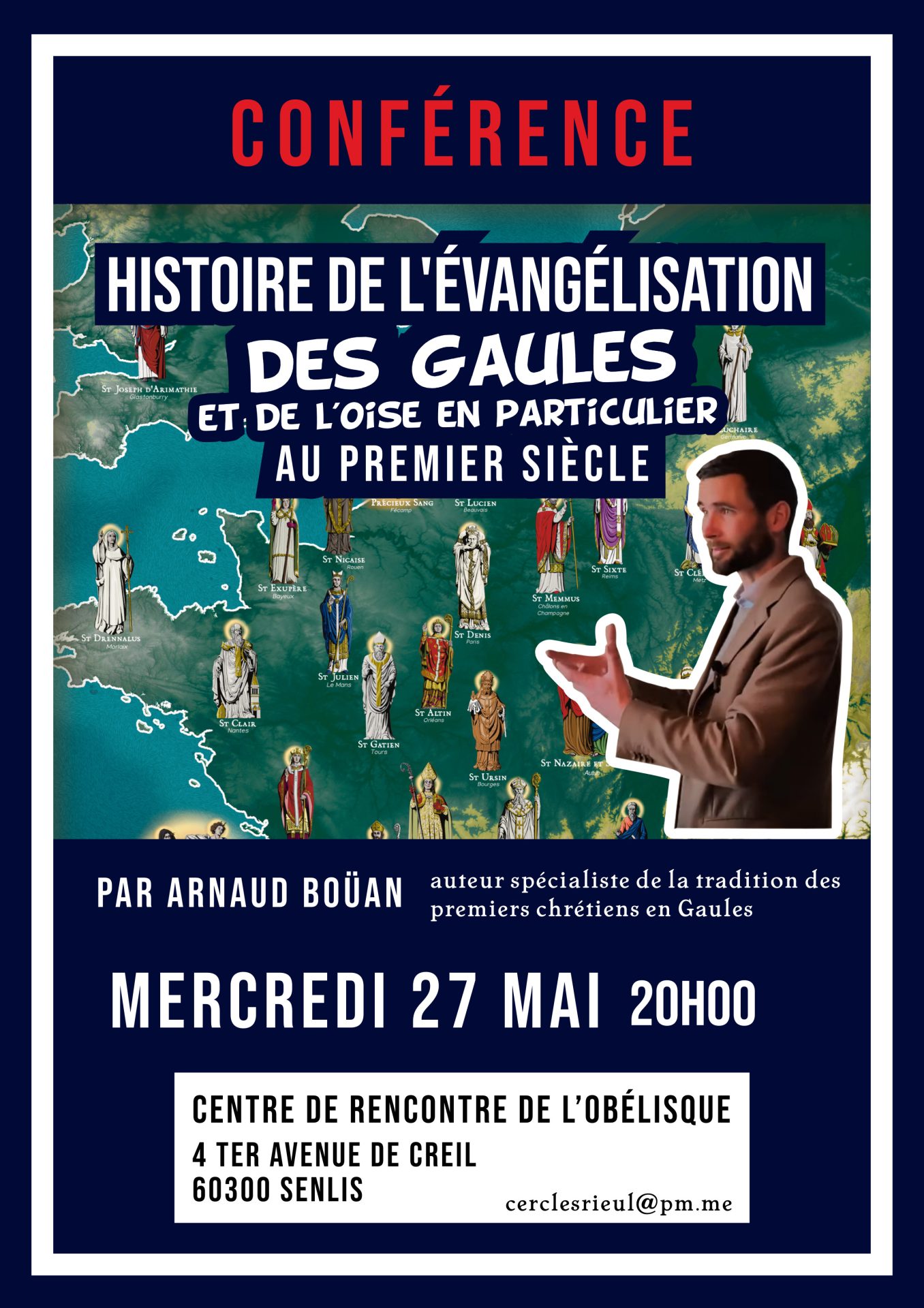 Conférence le mercredi 27 mai à 20h à Senlis : “Histoire de l’évangélisation des Gaules et de l’Oise en particulier au 1er siècle”.