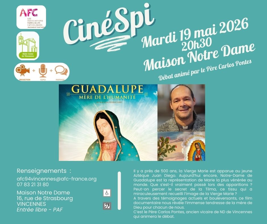 L’Association Familiale Catholique de Vincennes et St Mandé vous invite à sa séance de CinéSpi, spécial mois de mai, le mois de Marie : le mardi 19 mai à 20h30 à la Maison Notre Dame de la paroisse Notre Dame de Vincennes.