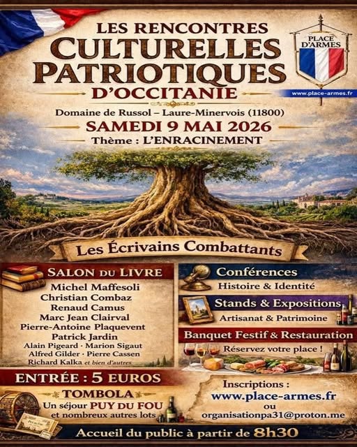 SAMEDI 9 MAI : L'ENRACINEMENT - LES ECRIVAINS COMBATTANTS Christian Combaz, Brigitte Lundi, Michel Maffesoli, Renaud Camus, Patrick Jardin, Pierre-Antoine Plaquevent - Marion Sigaut - Alfred Gilder - Pierre Cassen ... CONFERENCES : - Histoire et identité Stands artisanat et patrimoine Banquet festif INSCRIPTION : www.place-armes.fr ACCUEIL DU PUBLIC : à partir de 8h30.