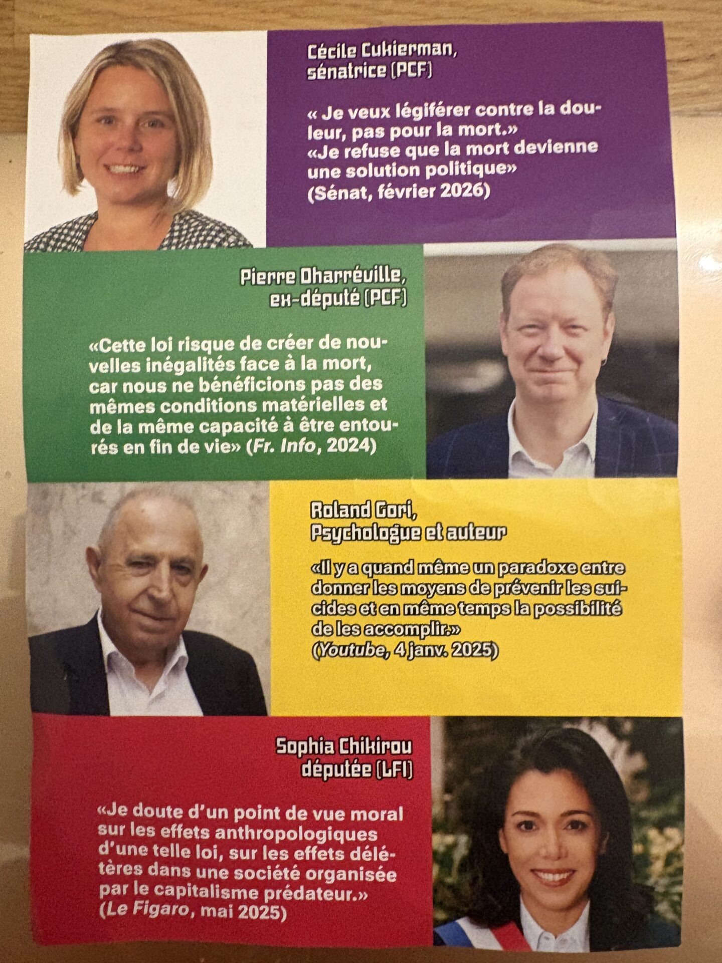 Un contact à l’Assemblée nous transmet ce tract (en écriture inclusive s’il vous plaît!) contre l’euthanasie. Voici un renfort un peu inattendu mais qui vaut la peine d’être connu. Il n’y a plus qu’à prier pour que les députés de gauche écoutent leurs électeurs…