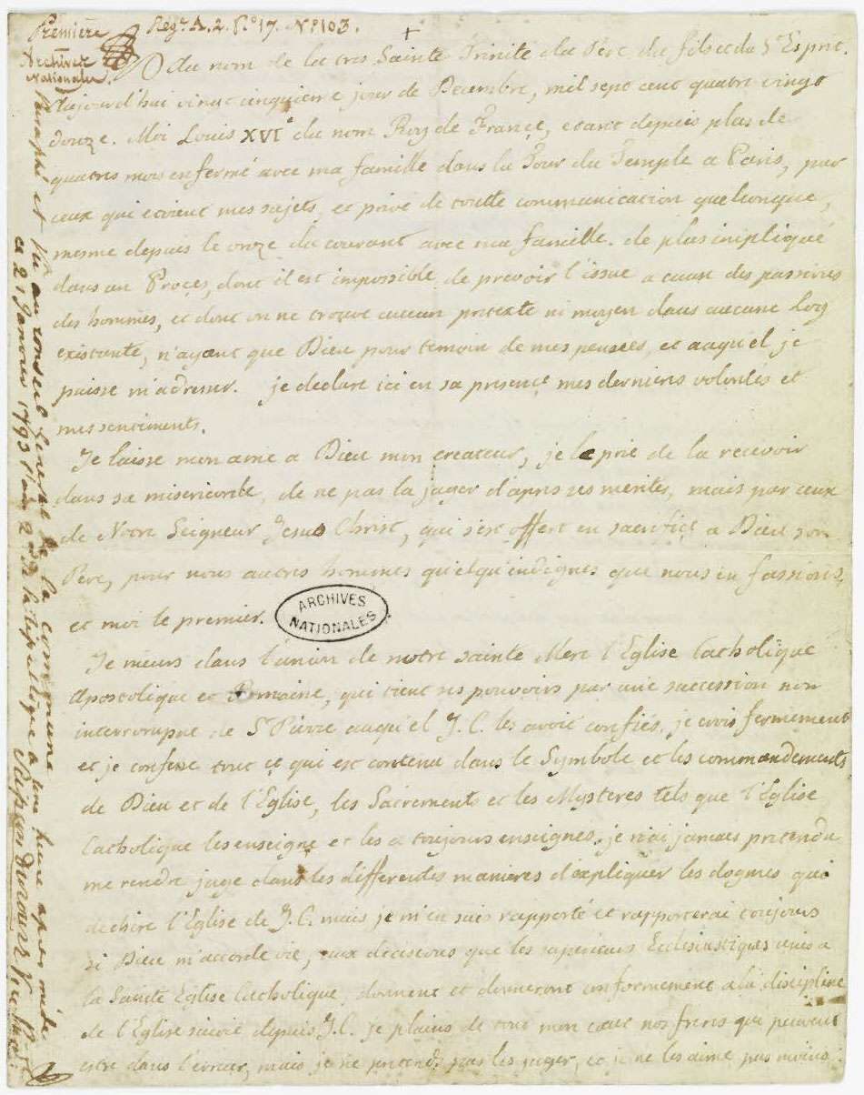 Aujourd’hui vingt-cinquième de décembre mil sept cent quatre vingt douze. Moi, Louis, XVIème du nom, Roi de France, étant depuis plus de quatre mois enfermé avec ma famille dans la Tour du Temple à Paris, par ceux qui étaient mes sujets, et privé de toute communication quelconque, même depuis le onze du courant avec ma famille. De plus impliqué dans un Procès dont il est impossible de prévoir l’issue à cause des passions des hommes, et dont on ne trouve aucun prétexte ni moyen dans aucune loi existante, n’ayant que Dieu pour témoin de mes pensées, et auquel je puisse m’adresser. Je déclare ici en sa présence, mes dernières volontés et mes sentiments.