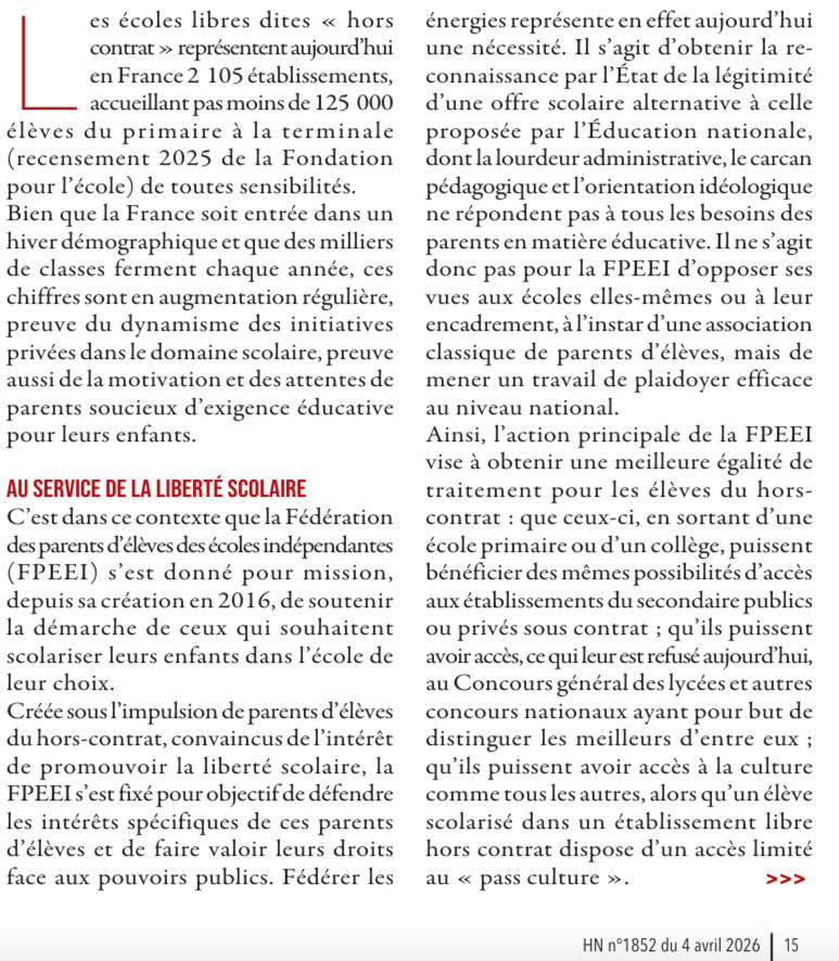 Extrait de la tribune de Marie des Neiges Guillotel, présidente de la Fédération des parents d’élèves des écoles indépendantes (FPEEI), dans l’Homme Nouveau :