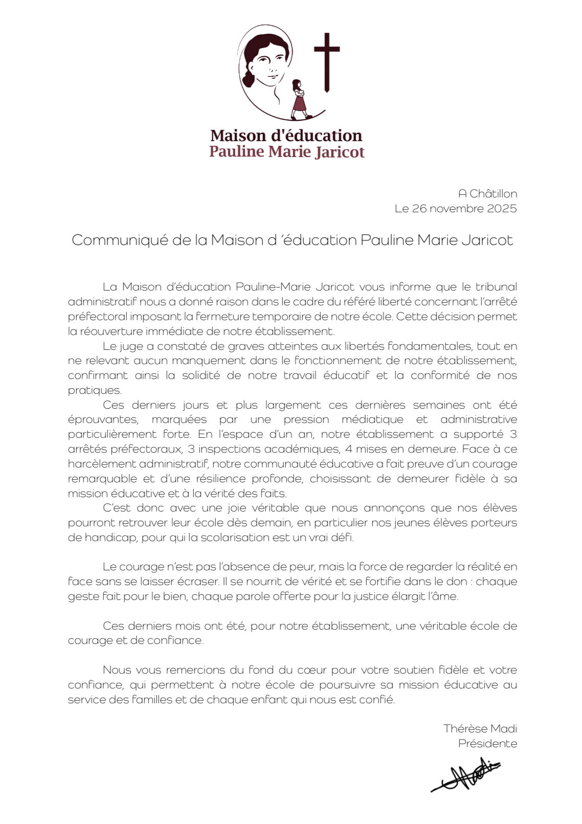 Thérèse Madi, Présidente – Maison d’éducation Pauline-Marie Jaricot, se réjouit de cette bonne nouvelle :