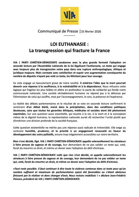 Malgré un scrutin nettement plus serré que lors de la 1ère lecture en mai 2025, les députés ont adopté la proposition de loi sur l’euthanasie et le suicide assisté. Le clivage au sein du Parlement révèle celui de la société face à un basculement qui est celui de tous les dangers. Le Syndicat de la Famille appelle les sénateurs à réécrire le texte en profondeur pour faire un choix audacieux, celui de la fraternité et de l’unité en fermant la porte à toute forme de transgression de l’interdit de tuer. L’adoption unanime de l’autre proposition de loi qui porte sur le développement des soins palliatifs montre la voie à suivre pour vivre dans la dignité.