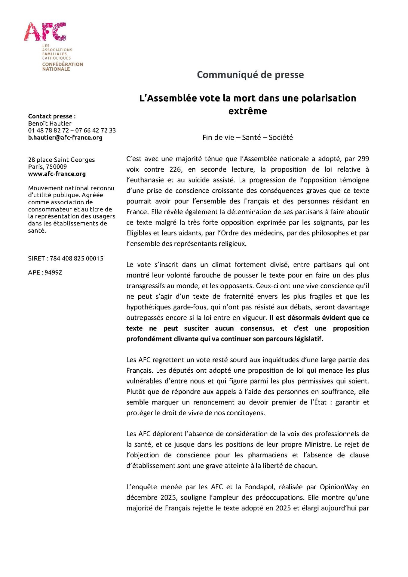 Malgré un scrutin nettement plus serré que lors de la 1ère lecture en mai 2025, les députés ont adopté la proposition de loi sur l’euthanasie et le suicide assisté. Le clivage au sein du Parlement révèle celui de la société face à un basculement qui est celui de tous les dangers. Le Syndicat de la Famille appelle les sénateurs à réécrire le texte en profondeur pour faire un choix audacieux, celui de la fraternité et de l’unité en fermant la porte à toute forme de transgression de l’interdit de tuer. L’adoption unanime de l’autre proposition de loi qui porte sur le développement des soins palliatifs montre la voie à suivre pour vivre dans la dignité.