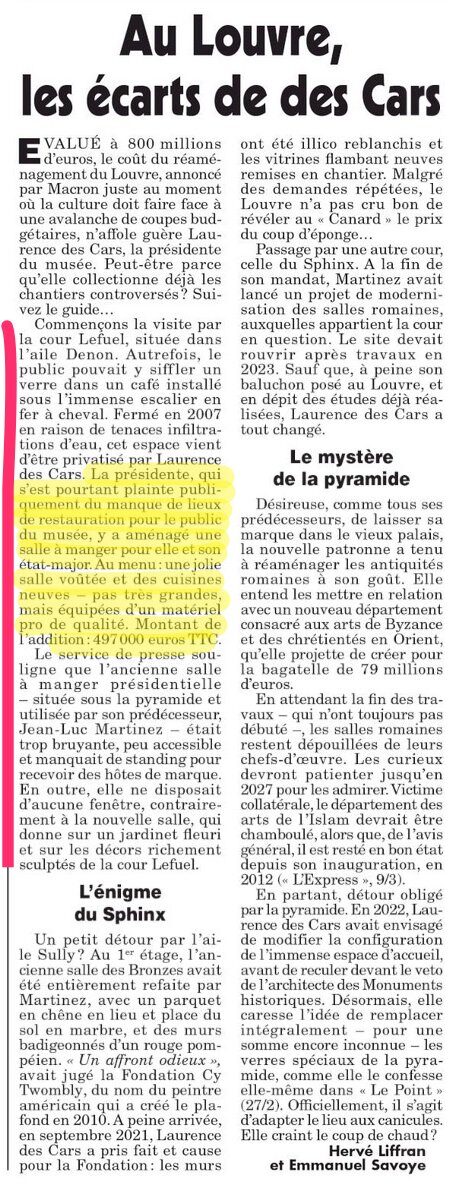 Un rapport explosif adressé au ministre de la Culture en janvier dernier dévoilait l’état alarmant du Louvre. Dans cette note confidentielle, datée du 13 janvier, Laurence des Cars, la présidente du musée parisien, alerte sur une «multiplication d’avaries» et souligne la nécessité de grands travaux. En mars, on apprenait que la présidente du Louvre avait préféré dépenser l’argent du musée pour réaliser une cuisine à 500 000€ :