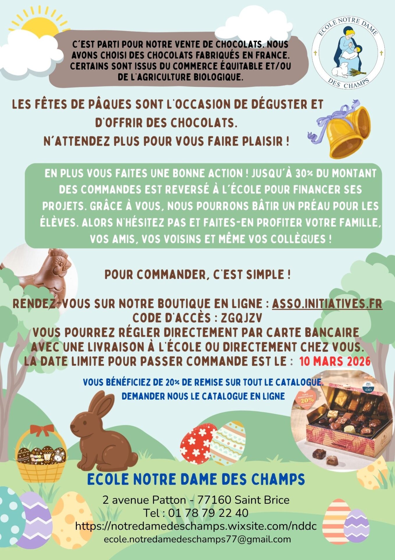 À l’occasion de Pâques, l’École Notre-Dame des Champs organise une vente de chocolats en ligne afin de financer la couverture de la terrasse existante, pour offrir aux enfants un espace abrité lors des récréations les jours de pluie (voir photo).