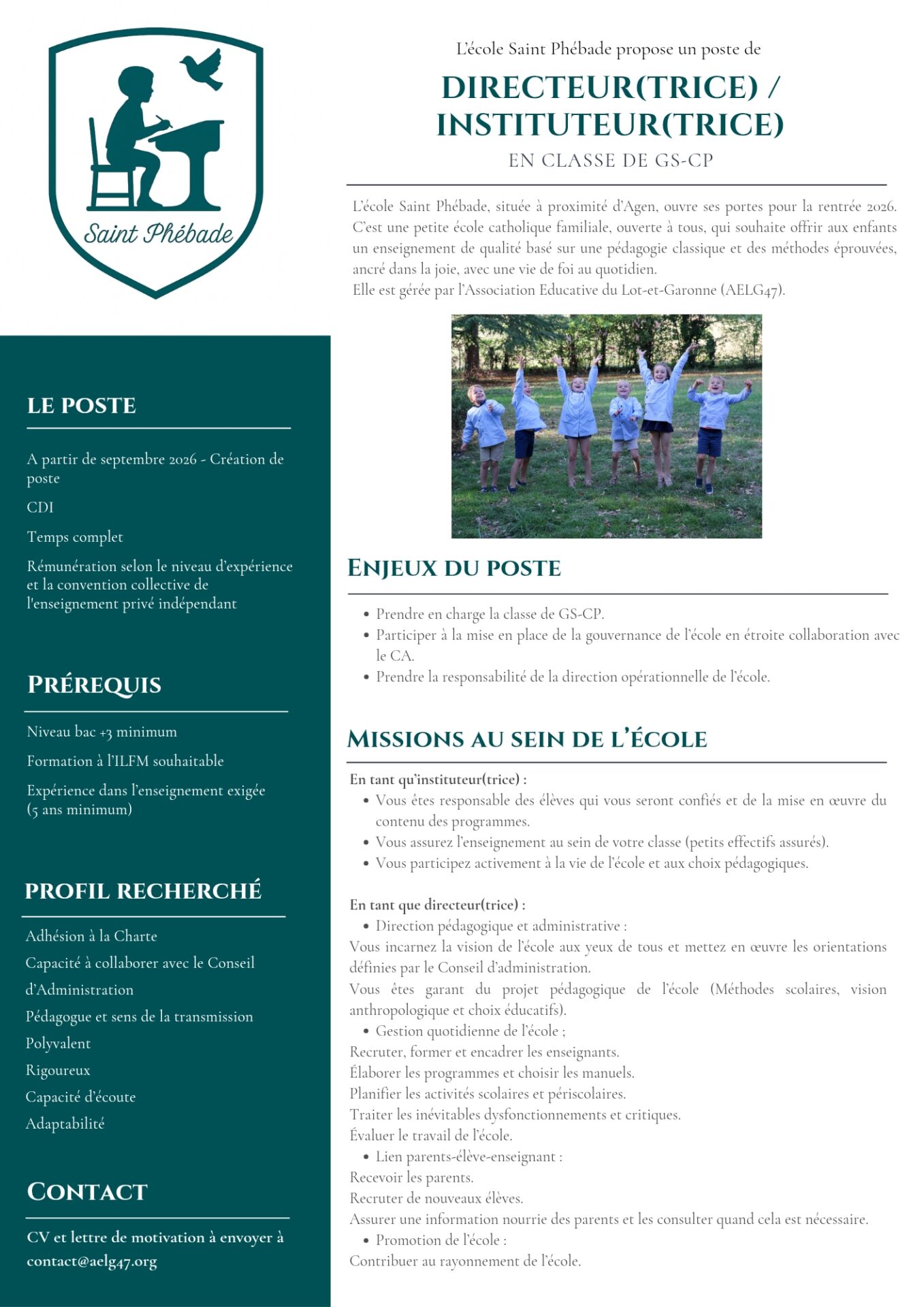 Pour ouvrir ses portes, l’école libre Saint Phébade recherche urgemment son (sa) Directeur(trice) / Instituteur(trice) en classe de GS-CP.