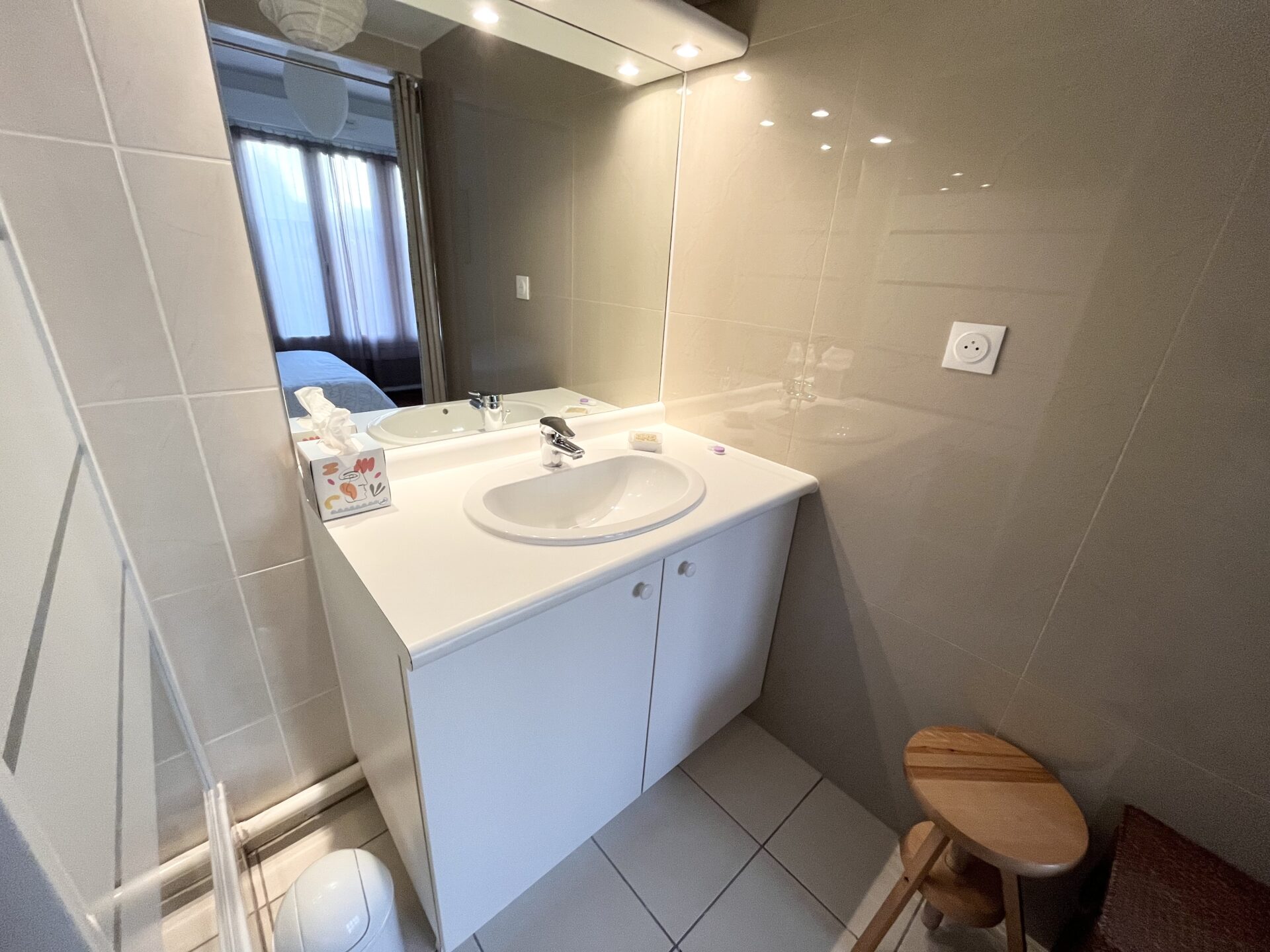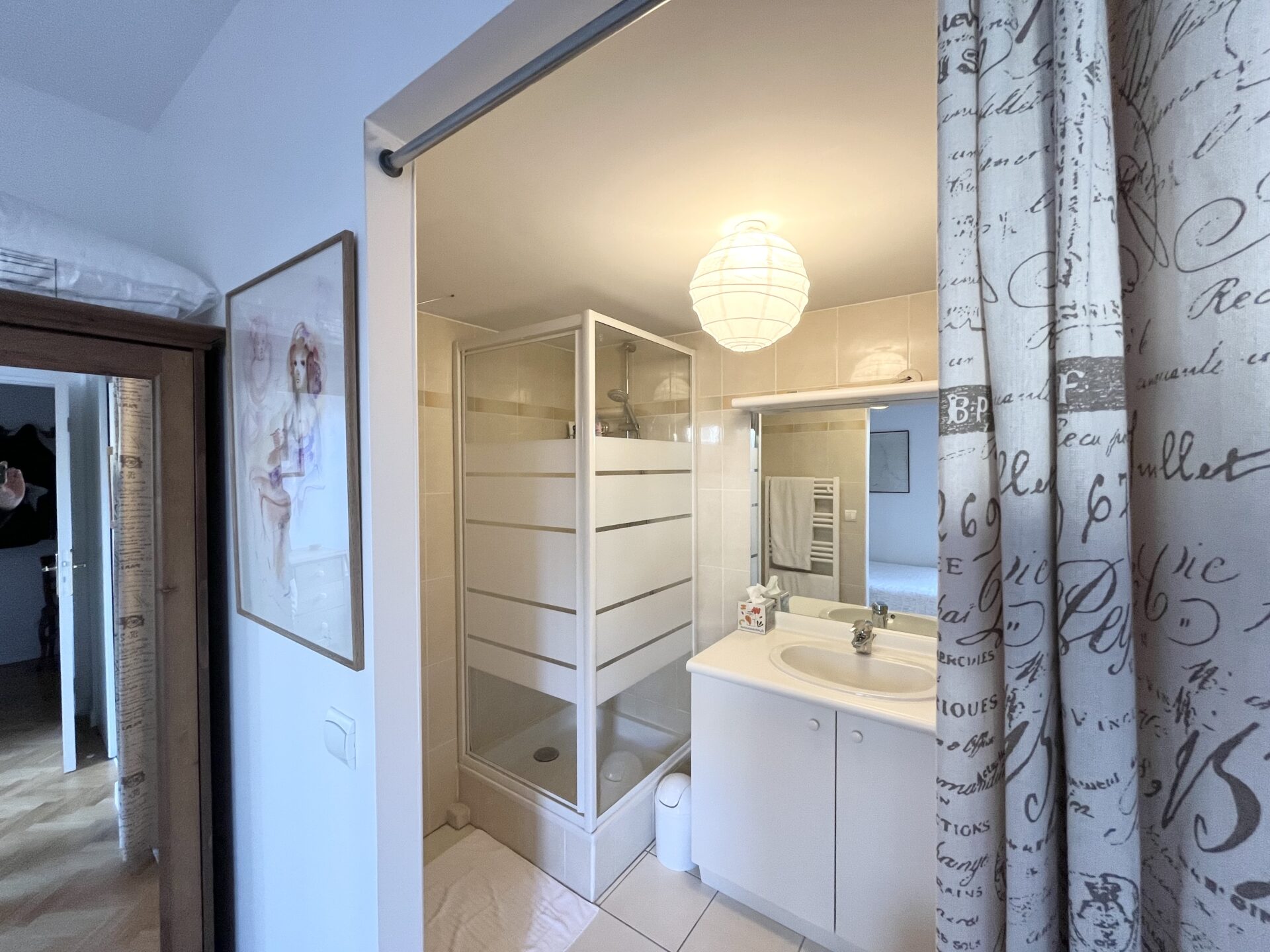 Il se compose d’une entrée ouvrant sur un grand séjour lumineux avec cuisine aménagée ouverte, une grande chambre avec placard et une salle de douche, WC séparés. Possibilité de le transformer en trois pièces avec 2 chambres et un séjour