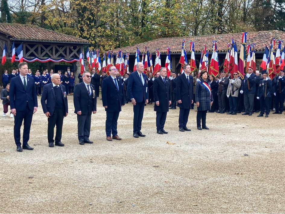 Les personnalités pendant la levée des couleurs, les hymnes et les dépôts de gerbes,Pierre-Emmanuel de La Forcade, délégué général du Bleuet de France, Michel Leboeuf, président de l’Union Nationale des Combattants de Vendée, Denis Giacommazzi, secrétaire nation de l’UNC, Valentin Josse, directeur départemental de l’ONACVG, Patrick Remm, président du Bleuet de France, Guillaume Jean, vice-président du Conseil départemental de la Vendée, Nicolas de Villiers, président du Puy du Fou et Véronique Besse, députée de la Vendée. Ces personnalités ont ensuite salué les porte-drapeaux des communes de Vendée.
