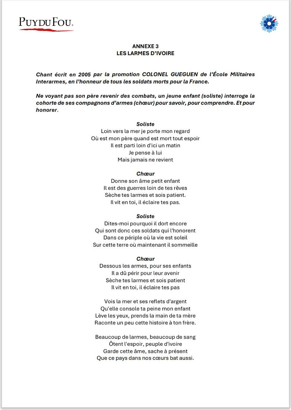 La cérémonie s’est poursuivie par « La lettre d’un Poilu » à sa femme, la veille d’un assaut où il perdra la vie, magnifique abnégation du soldat vendéen qui fais mon devoir. Enfin, c’est le chœur de Puy du Fou Académie, l’école du Puy du Fou, qui a entonné « Les Larmes d’Ivoire » composé en 2005 en l’honneur de tous les soldats, Morts pour la France.