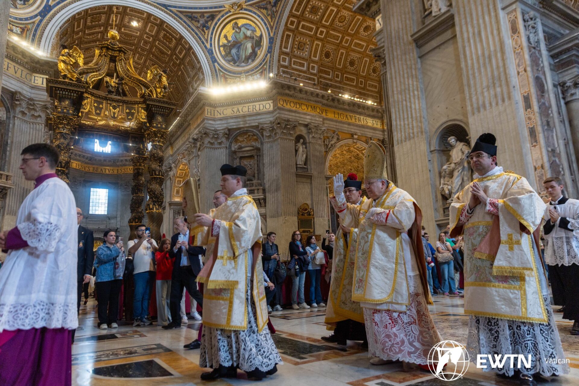 C’est pour moi une joie immense de célébrer la messe pontificale à l’autel de la chaire de Saint-Pierre, point culminant du pèlerinage Summorum Pontificum de 2025. Au nom de toutes les personnes présentes, j’exprime ma sincère gratitude à ceux qui ont travaillé avec tant de diligence et d’efficacité pour rendre possible ce pèlerinage. J’offre cette messe pour les fidèles de l’Église à travers le monde, qui s’efforcent de préserver et de promouvoir la beauté de l’Usus Antiquior du rite romain. Que l’offrande de la messe pontificale d’aujourd’hui nous encourage et nous fortifie tous dans l’amour de notre Seigneur eucharistique qui, par la tradition apostolique et avec un amour inébranlable et incommensurable pour nous, renouvelle sacramentellement son sacrifice sur le Calvaire et nous nourrit du fruit incomparable de son sacrifice : la nourriture céleste de son corps, de son sang, de son âme et de sa divinité.