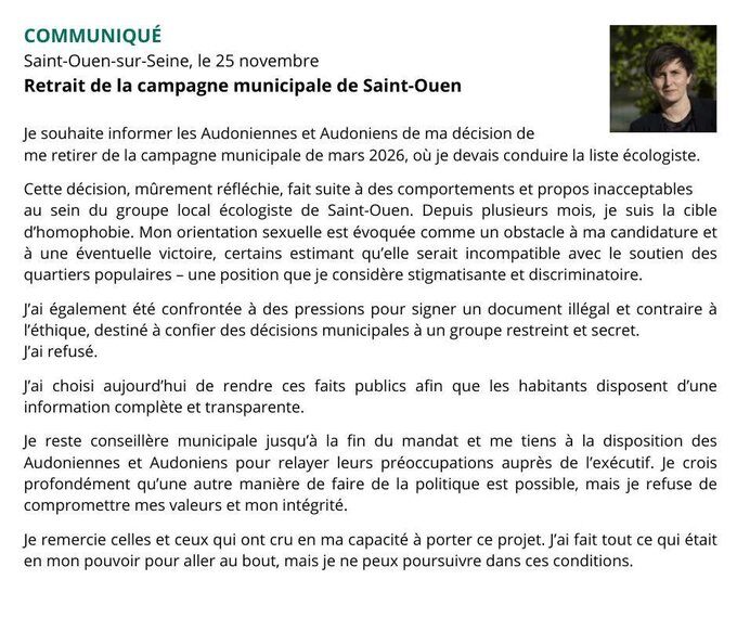 La candidate d’EELV pour Saint-Ouen Sabrina Decanton a indiqué être «la cible d’homophobie» au sein du groupe local de son parti.