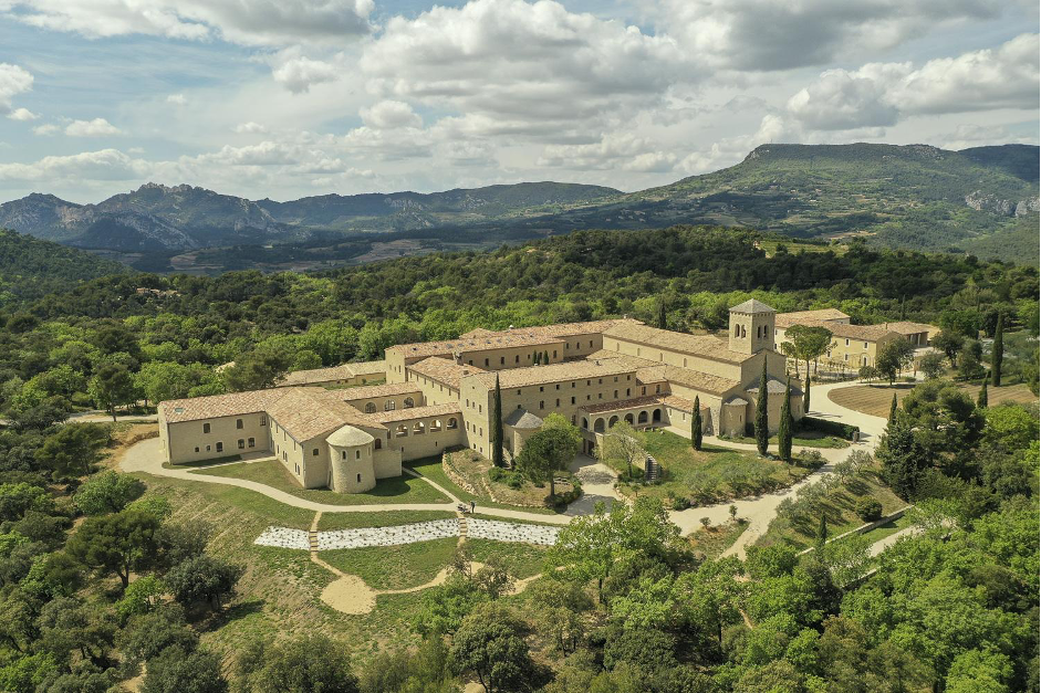 L’abbaye Sainte-Madeleine du Barroux vue du ciel, qui se situe au cœur de la Provence, à côté du Mont Ventoux