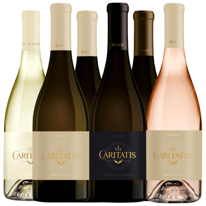 La gamme Via Caritatis rassemble dix cuvées (quatre rouges, deux rosés, quatre blancs) déclinées en quatre catégories qui célèbrent autant la tradition monastique que le terroir provençal :