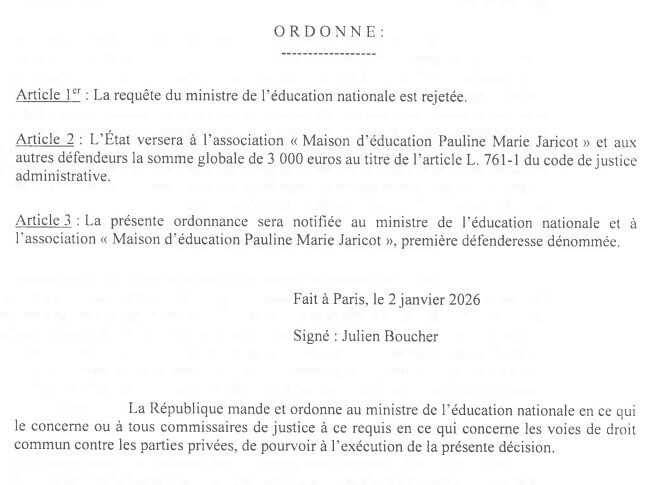 Le 2 janvier 2026, le Conseil d’État a rendu une décision majeure en faveur de la Maison d’Éducation Pauline-Marie Jaricot, mettant un terme à une procédure administrative lourde et éprouvante. Par cette ordonnance, la plus haute juridiction administrative a reconnu le bien-fondé de notre démarche et a sanctionné des décisions qui portaient une atteinte injustifiée à notre fonctionnement et à notre projet éducatif.