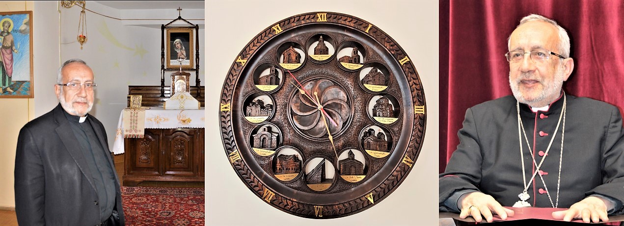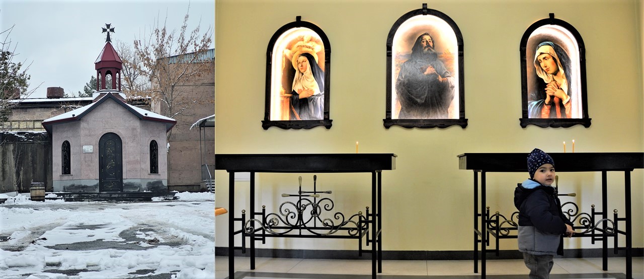 Mgr Raphaël Minassian parle le français couramment. Il est, comme la plupart du clergé, polyglotte. Il fait partie de la diaspora. Son archevêché passerait inaperçu, s’il n’y avait ce petit oratoire dans l’enceinte, où les fidèles viennent se recueillir et brûler un cierge devant trois peintures sacrées représentants la Vierge Marie et deux saints. Au-delà de l’Arménie, il est au service de la communauté catholique arménienne de toute l’Europe de l’est et de l’ex-URSS. Il est le berger de plus de 600 000 fidèles. Avec la pandémie, raconte-t-il, « j’ai dû arrêter tous mes déplacements depuis un an ». Dans son bureau, une magnifique peinture mariale, un autel où il célèbre sa Messe, des ornements liturgiques, des photos. Au-dessus du petit canapé une horloge circulaire en bois où sont sculptées les églises qu’il a faites construire depuis qu’il est devenu archevêque, en 2013. Ce 11 février, l’Eglise fête Notre-Dame de Lourdes, et, c’est, aussi, la fête de saint Vartan. Nous retrouverons Mgr le we suivant autour de quelques gâteaux locaux, d’un café arménien (à ne pas confondre avec le café turc). Il répondra à nos questions, lors d’une longue interview.