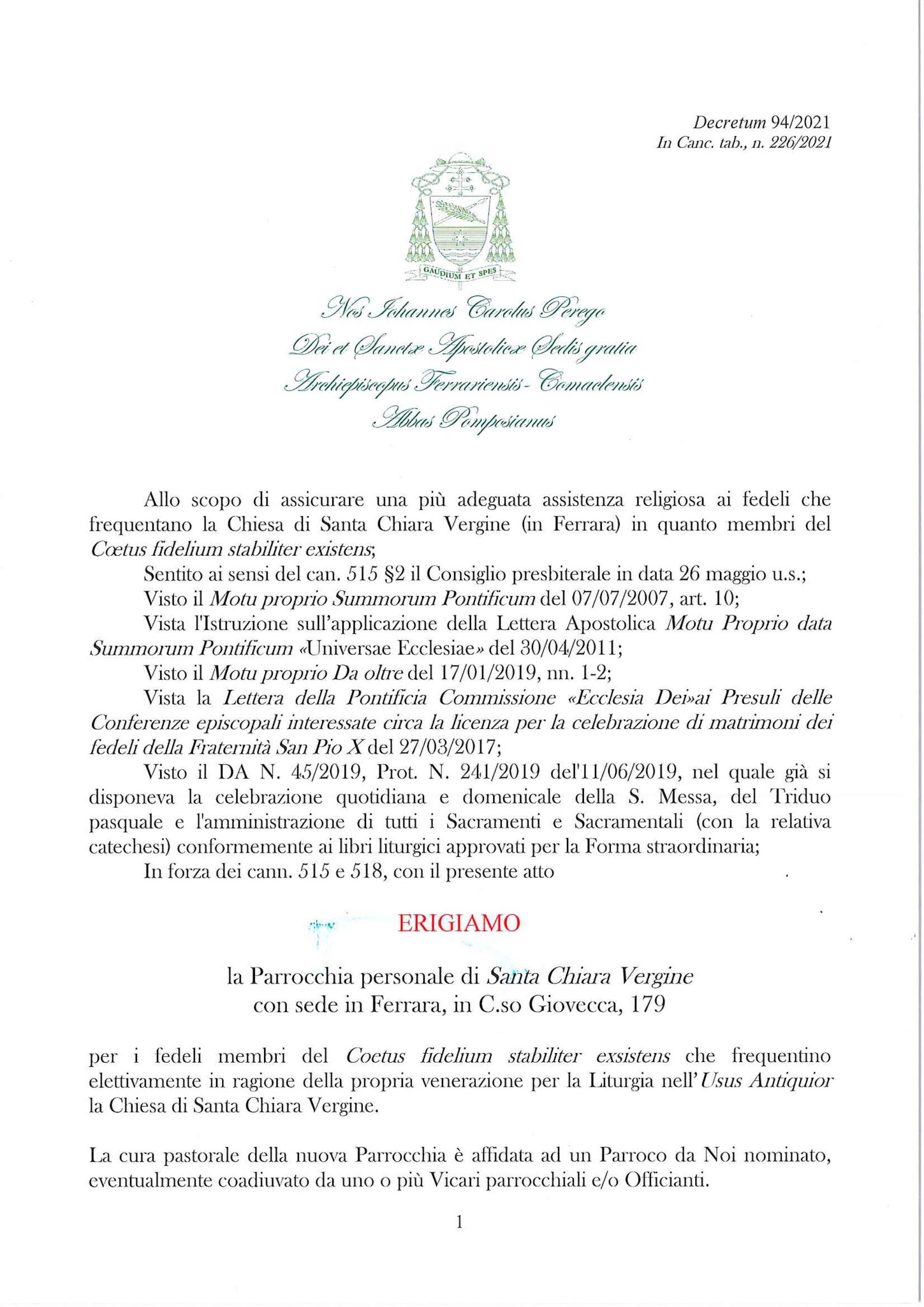 L’archevêque, prenant acte de l’existence d’un coetus fidelium existens, d’un groupe de fidèles existant, a décidé de leur offrir les services d’une paroisse personnelle confiée à un curé, avec éventuellement à un vicaire. A ces fidèles seront dispensés la messe (quotidienne et dominicale), le Triduum pascal et tous les sacrements et sacramentaux en la forme extraordinaire. Le décret consolide ainsi une situation existante : il précise en effet que ces services existaient déjà, y compris con la relativa catechesi, avec le catéchisme correspondant.