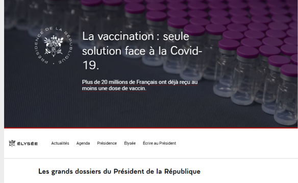 D’où le souhait de suivre tout ce qui relève des traitements de l’épidémie de covid (nos renvois par exemple fréquents au blog du Dr Maudrux, mieux armé pour une veille scientifique), moyen traditionnel de lutte contre les épidémies ; curieusement oublié contre le covid sauf peut-être avec l’épisode étonnant du Remdesivir ou l’annonce claironnée par M.Véran d’anticorps monoclonaux qui ne semblent plus d’actualité. Il y a longtemps que, pour le gouvernement, au-delà du trompettage à haute dose autour de la réanimation, la solution unique est la vaccination y compris étendue aux enfants et adolescents, comme symbolisé par des annonces du site officiel de l’Elysée (vue capturée le 29 mai), et à rebours de tout principe de précaution si généreusement brandi dans les épisodes tant de l’HCQ et de l’azythromycine que de l’ivermectine.