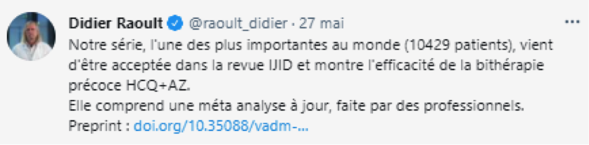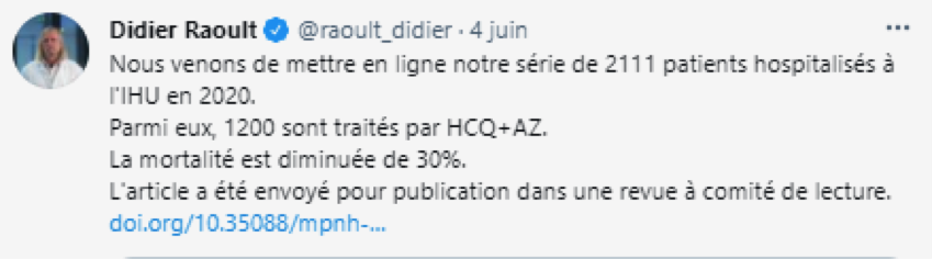 Le 4 juin, il annonce la mise en ligne d’un article portant sur 2111 patients hospitalisés à l’IHM (« Outcomes of 2,111 COVID-19 hospitalised patients treated with hydroxychloroquine/azithromycin and other regimens in Marseille, France : a monocentric retrospective analysis ») :