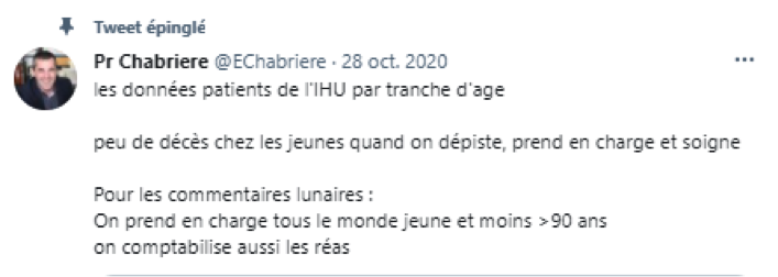 - Cette accusation de pratique d’un tri des patients pour ne garder que ceux ayant un diagnostic le plus favorable est assez fréquente. A tel point que l’IHM est constamment obligée de rappeler que ce n’est pas ce qu’elle pratique. C’est par exemple le tweet épinglé figurant sur le compte Twitter du M.E. Chabrière (professeur de biochimie à l’IHU de Marseille et l’un de ses fervents défenseurs sur Twitter):
