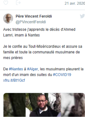 - Le plus récent (et le plus hallal) : le 21 avril 2020, le Père Feroldi, grand ordonnateur du SNRM ((Service national de la Conférence des Evêques de France pour les relations avec les musulmans) qui s’extasie quotidiennement devant les beautés de l’islam, a tweeté le 21 avril, à propos du décès d’un imam, qu’il le confiait au « Tout-Miséricordieux ».