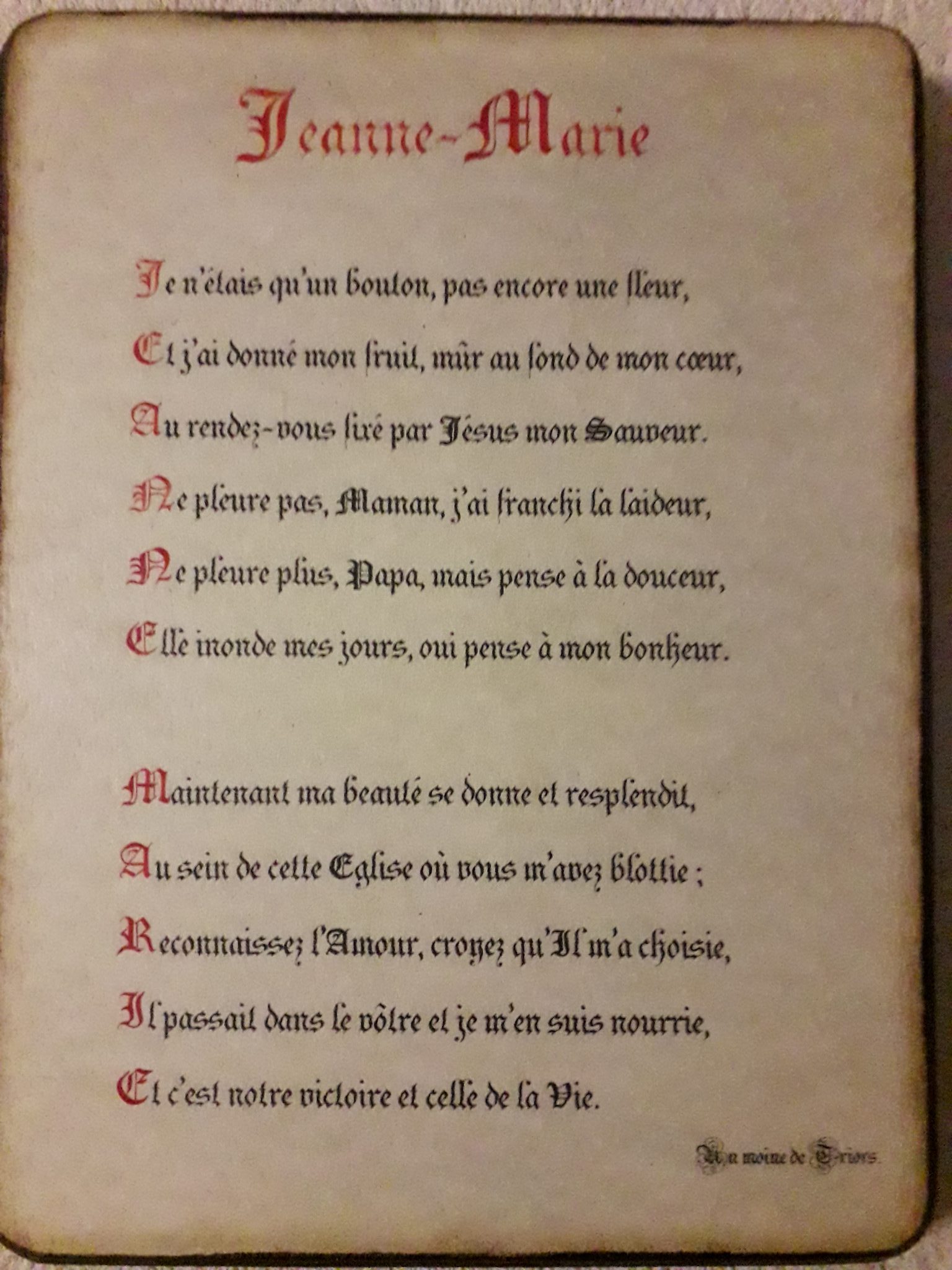 En l’honneur de ce quinzième anniversaire, voici le poème reçu en son temps d’un moine de Triors. Peut-être trouverait-il un écho dans d’autres coeurs meurtris par de douloureuses épreuves…