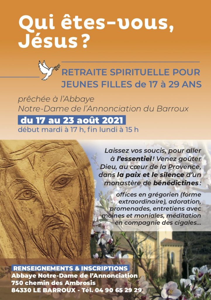 Retraite spirituelle pour jeunes filles de 17 à 29 ans, prêchée à l'Abbaye Notre-Dame de l’Annonciation du 17 au 23 août 2021. Conférences, offices en grégorien (forme extraordinaire), promenades, entretiens avec moines et moniales… Renseignements et inscriptions : Abbaye Notre-Dame de l’Annonciation - 750 chemin des Ambrosis - 84330 Le Barroux -Téléphone : … Lire la suite de 17-23 août : Retraite pour jeunes filles à l’Abbaye Notre-Dame de l’Annonciation