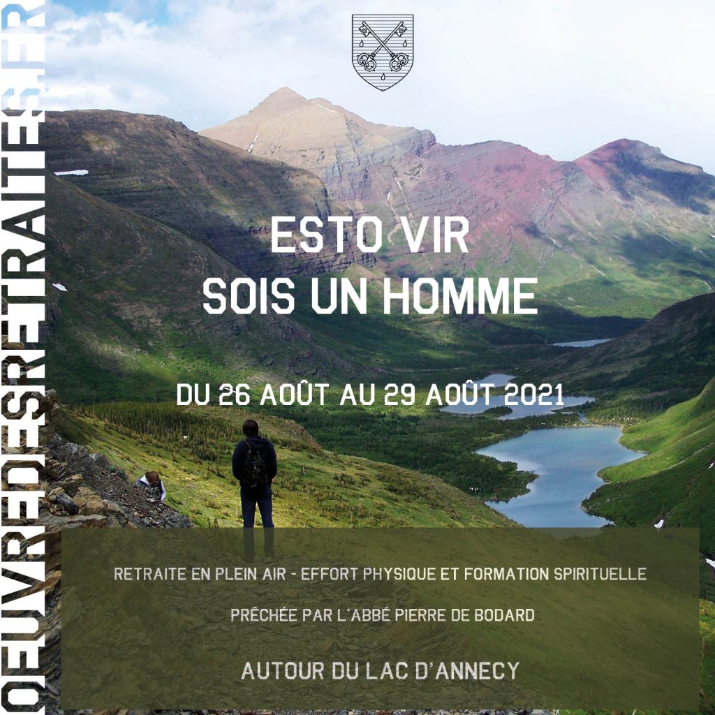 Aux hommes modernes qui doivent être pourvus d’équilibre mental, de solidité nerveuse, de jugement, de courage moral, et de résistance à la fatigue : Retraite spirituelle en plein air. Pour hommes (à partir de 18 ans) Raid de quatre jours en autonomie autour du lac d’Annecy. Effort physique et formation … Lire la suite de Du 26 au 29 août : retraite ESTO VIR – sois un homme