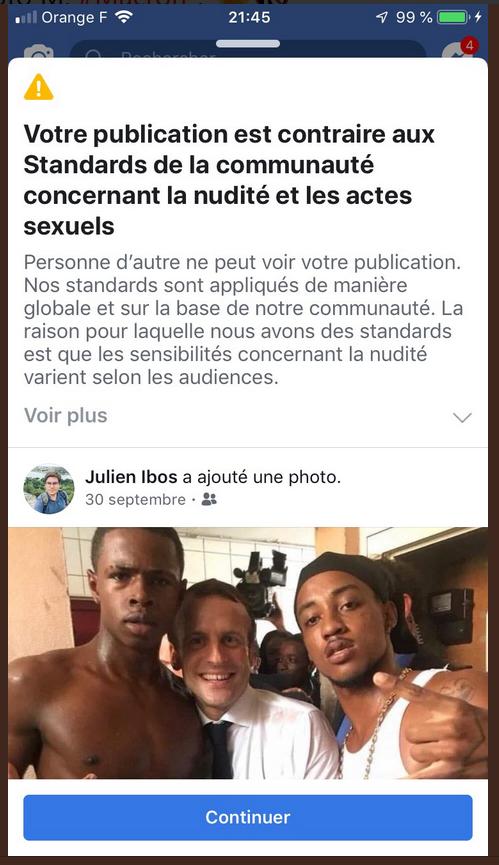 Il faut constater que facebook considère que le Président de la République française diffuse des contenus pornographiques sur Internet! C’est certes un point de vue, qu’on peut discuter, mais qu’on doit relever!