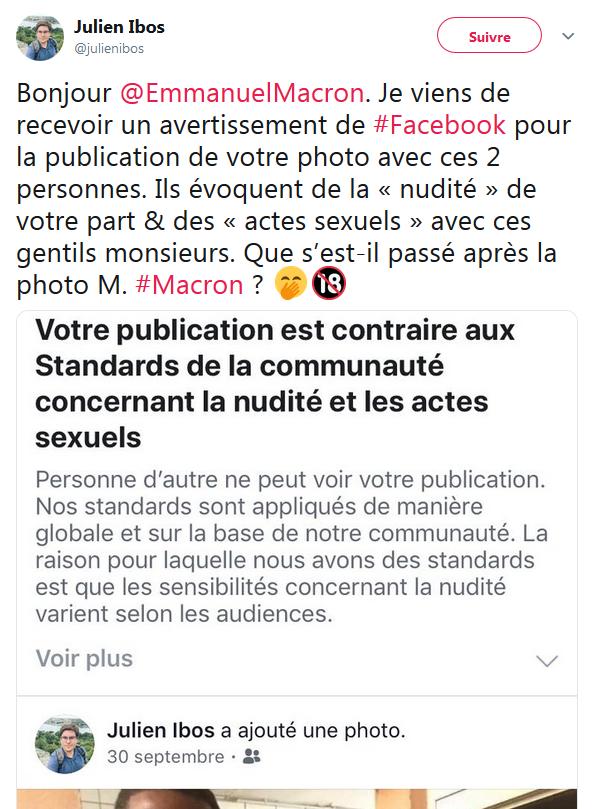 Facebook considère que la photo de Macron avec les 2 détenus concerne “la nudité et les actes sexuels”. Il est vrai que cette photo a choqué toute la France.