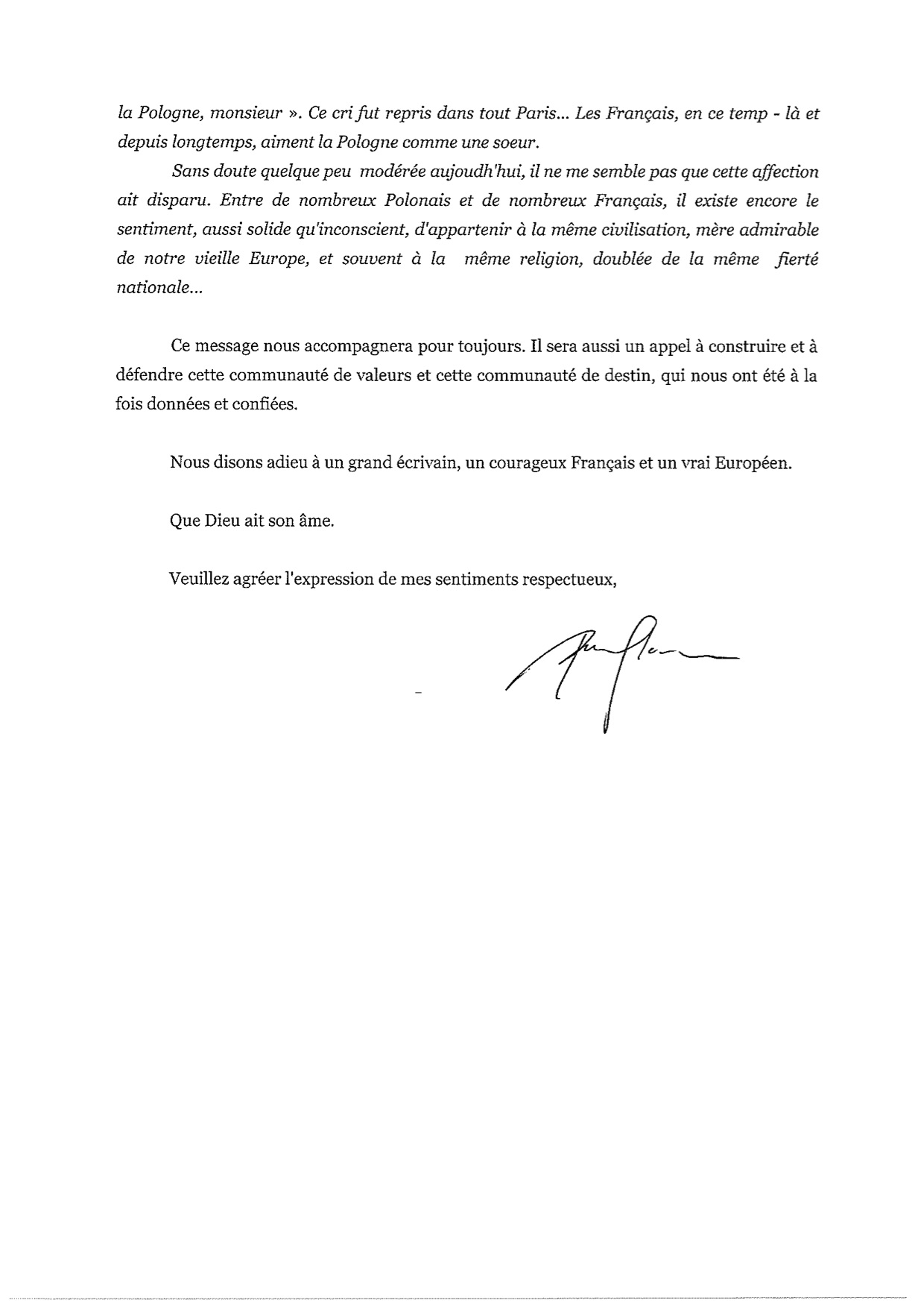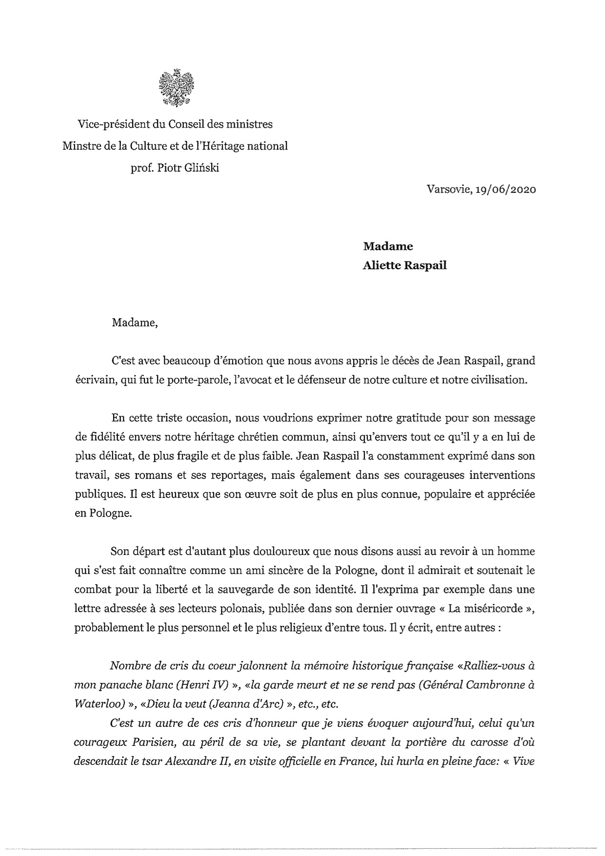 « le Ministre de la Culture et le Vice-président du Conseil des Ministres du gouvernement de Pologne a fait ses adieux à Jean Raspail, un grand écrivain, un courageux Français et un vrai Européen. »