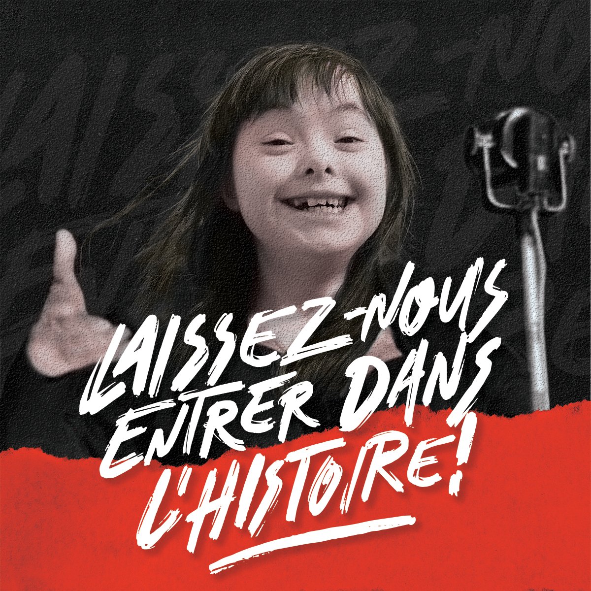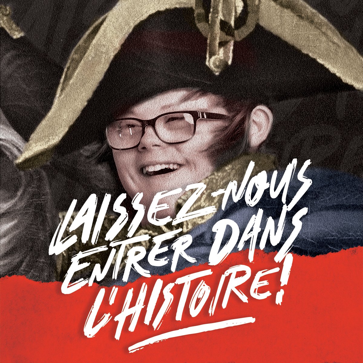 Cette campagne « Laissez-nous entrer dans l’histoire » s’inspire de cinq personnages célèbres qui ont marqué l’histoire : Charlie Chaplin, le Général De Gaulle, Edith Piaf, Napoléon et une joueuse de l’équipe de France de football dont les visages ont été remplacés par ceux d’enfants porteurs de trisomie 21.