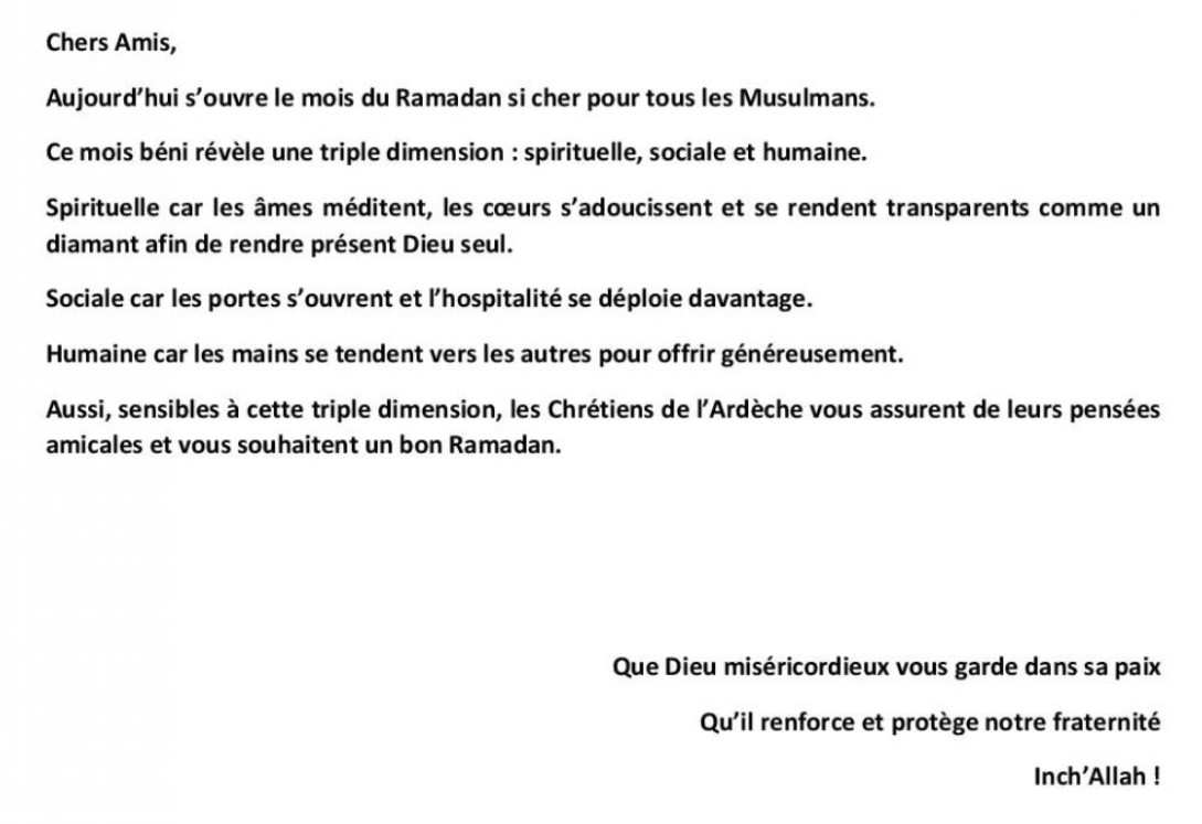 Mais ce n’est pas tout. Ce même diacre permanent est l’auteur d’un message adressé aux musulmans pour marquer le début du ramadan et qui se finit par un magnifique “Inch’Allah” !