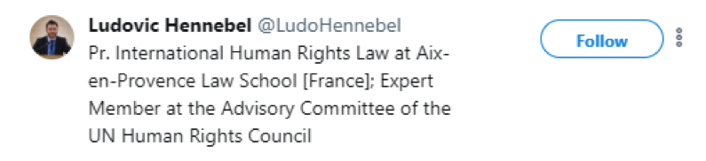 Un troisième expert de l’ONU a tweeté contre Grégor Puppinck : Ludovic Hennebel. Celui-ci conseille une autre instance des Nations unies, le Conseil des droits de l’homme, dont les États-Unis se sont retirés en juin 2018. Encore un tweet qui nous donne envie de lire Les droits de l’homme dénaturé.