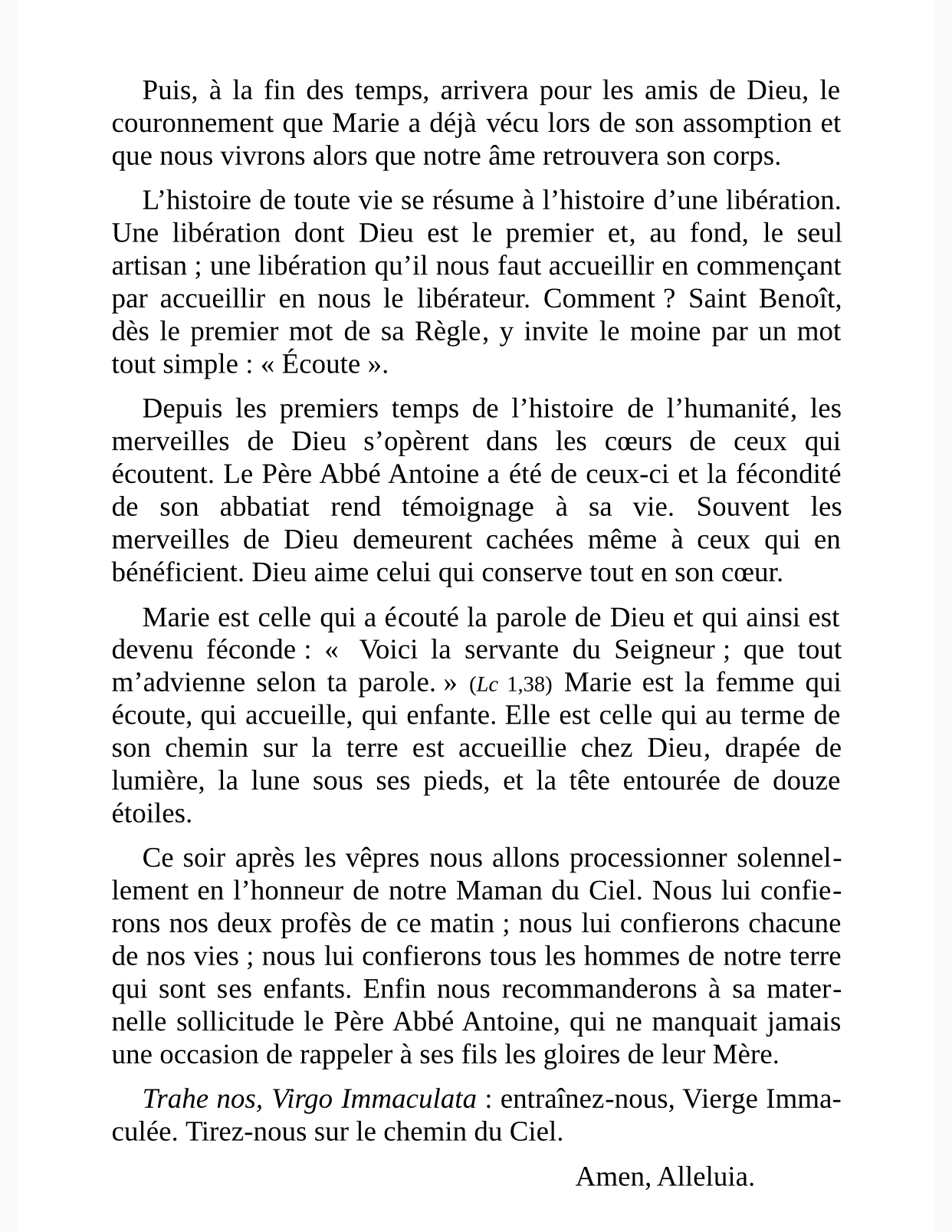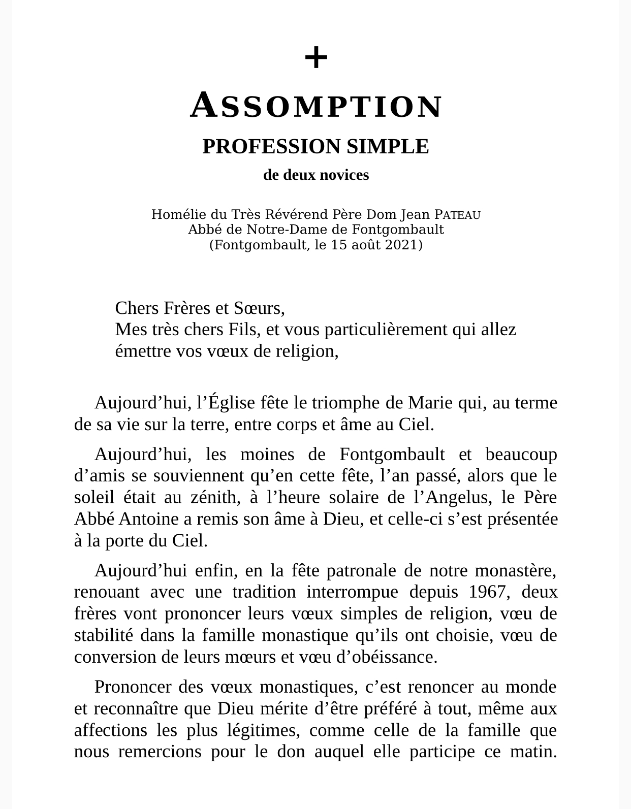 Voici l’homélie prononcée par le père abbé de Fontgombault en cette fête de l’Assomption, au cours de laquelle deux moines ont fait profession simple, ainsi que l’allocution prononcée lors des Vêpres :