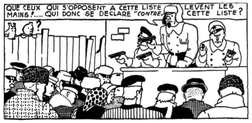 Tout le monde connaît ce célèbre dessin d’Hergé dans Tintin au pays des soviets, montrant les pratiques de la démocratie en pays communiste :