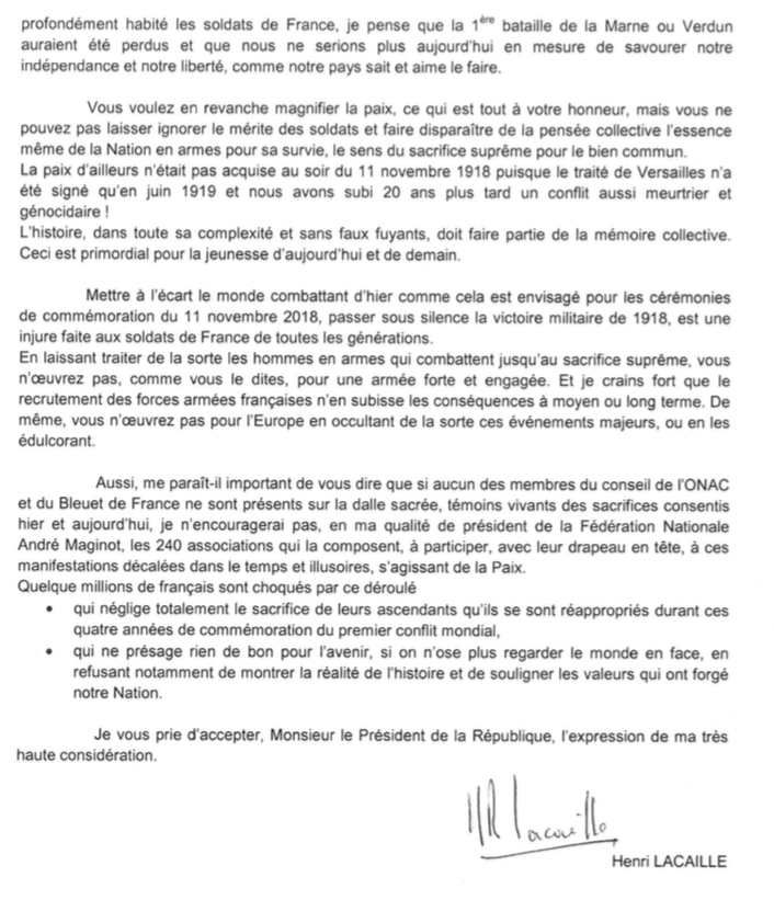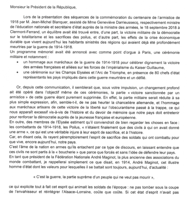 Lettre de l’amiral Henri Lacaille, président de la Fédération Nationale André Maginot, au président de la République à propos des cérémonies prévues le 11 novembre :