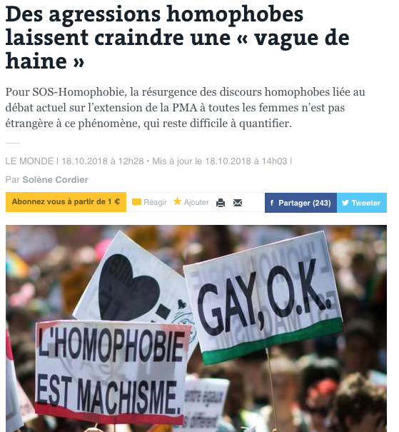 Depuis quelques jours, suite à quelques agressions contre des personnes homosexuelles, souvent commises par des personnes issues de l’immigration, sont utilisées de façon indécente par le lobby LGBT pour museler les défenseurs de la famille et de l’enfant. Le Monde relaie complaisamment cette propagande :