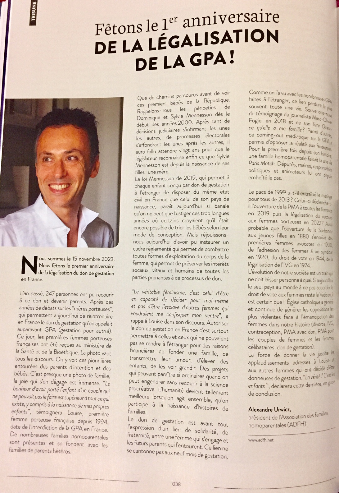 Le numéro de ce trimestre publie une tribune d’Alexandre Urwicz, président des familles homoparentales (ADFH), en faveur de la location d’utérus et de la vente d’enfants – ladite GPA – dans laquelle il s’en prend – sans originalité – à l’Eglise catholique :