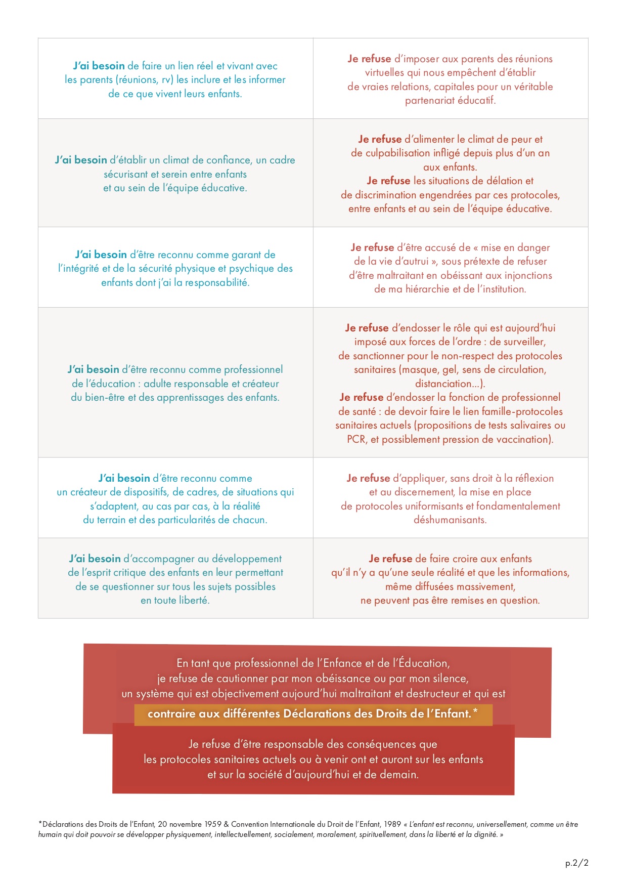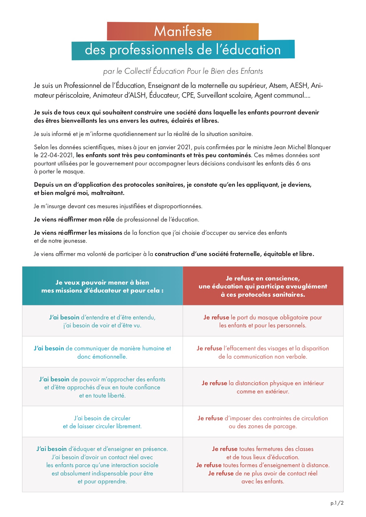 De son côté, le collectif Éducation Pour le Bien des Enfants, rassemblant des professionnels de l’éducation (enseignant de la maternelle au supérieur, Atsem, AESH, Animateur périscolaire, Animateur d’ALSH, Éducateur, CPE, Surveillant scolaire, Agent communal…) a rédigé un Manifeste pour réaffirmer ses missions au service de l’enfance et de la jeunesse :