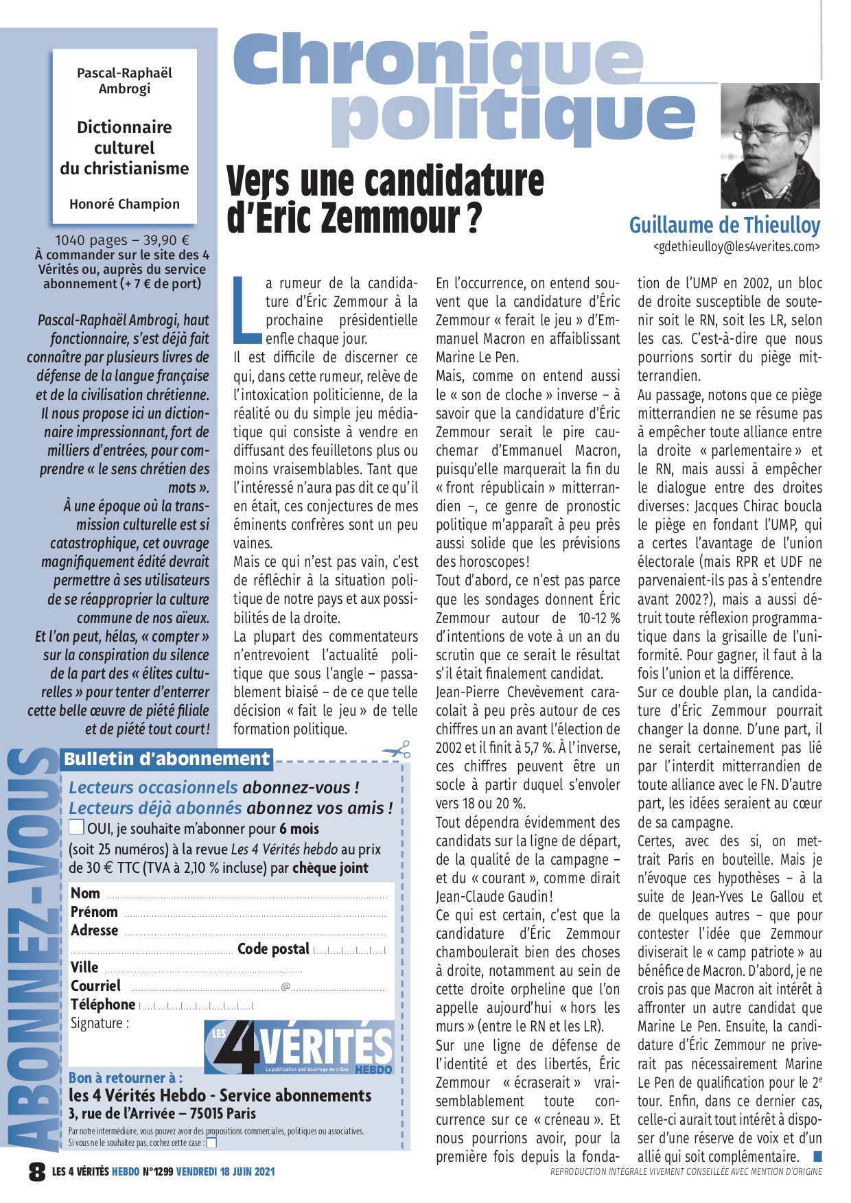 La candidature Zemmour est déjà présentée comme entrave à Marine (nouveau front républicain déguisé pour endormir l’électeur façon macron)… donc Zemmour est le seul actuellement qui puisse sauver la France. Les Français devraient le lire et l’écouter et non les devins au service de la bienpensance macronienne et autre….