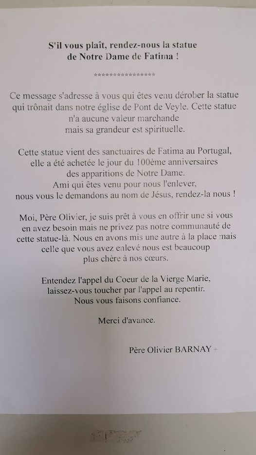 Qu’à l’approche du 13 mai, ND de Fatima intercède pour cette communauté… Et pour toucher le coeur du voleur
